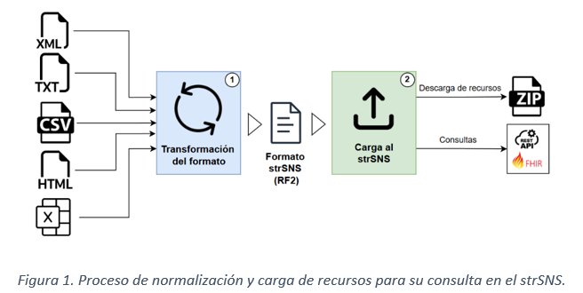 Para compartir estos recursos, primero se transforman sus formatos originales, como XML, CSV, TXT, HTML o Excel, al estándar RF2 (TSV) con codificación UTF-8. Este proceso, que se observa en el bloque de Transformación del formato (1) en la Figura 1, garantiza una presentación homogénea y estandarizada.